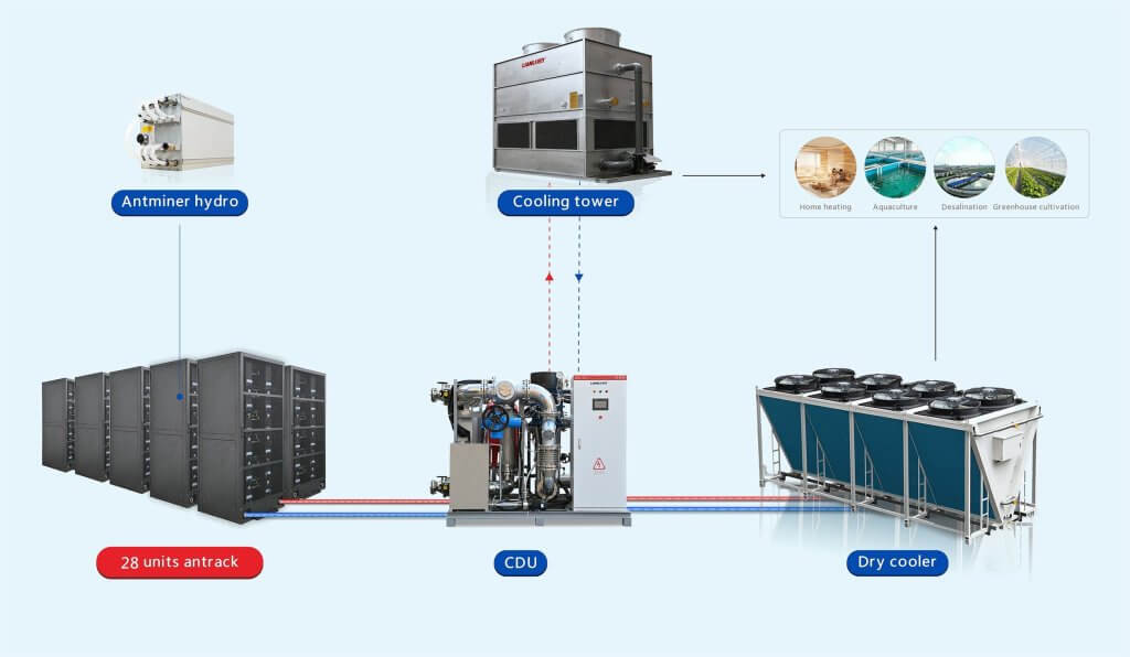28-unit antminer hydro rack 380v 50Hz+ 200kw CDU with heating function 380V 50Hz+ 200kw dry cooler with fan speed control @30C 380V 50Hz